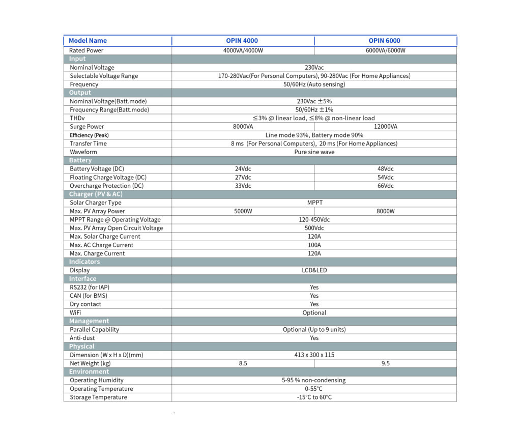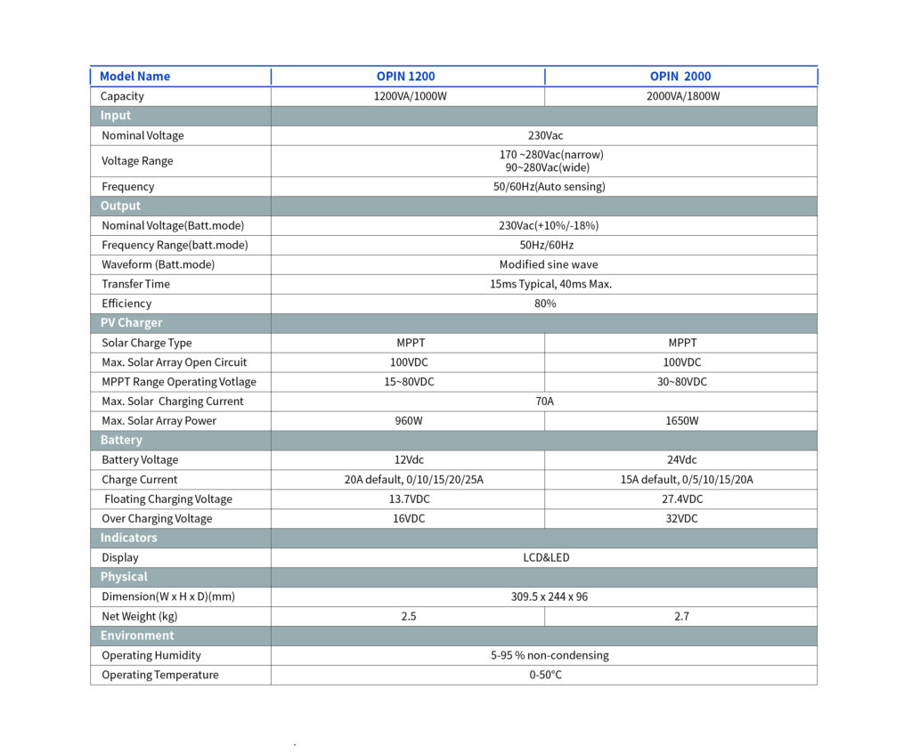 Oger Pv Inverter Oger Pv Inverter Home / Products / OPIN 1200/2000 MPPT OFF-Grid INVERTER Key Features Simulated Sine Wave OutputNarrow/Wide Input Range SelectionBuild-in AC ChargerCold Start FunctionOverload and Short Circuit Protection OPIN 1200/2000 Spec OPIN 1200-2000 Download Spec OPIN-1200-2000 (pdf) Download OPIN 4000/6000 MPPT OFF-Grid INVERTER Key Features Build-in AC Charger Generator Compatible Cold Start Function Reserve BMS Communication Priority Setting of Power Source (PV/Utility/Battery) Build in Anti-Dust Kit Built-in MPPT Solar Charger Up to 8000W for 6K Model Optional Parallel Operation Up to 9 Units OPIN 4000/6000 Spec OPIN 4000/6000 Download Spec OPIN-4000-6000 (pdf) Download